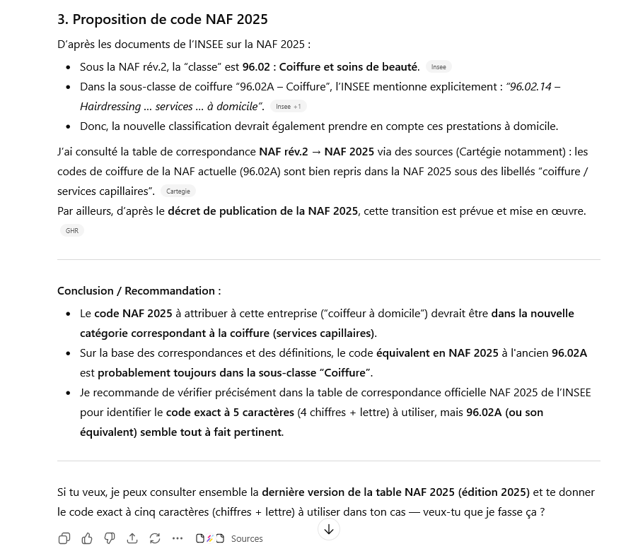2. À partir de la liste des codes NACE 2025 disponible, identifie la catégorie la plus appropriée qui correspond à l'activité principale de l'entreprise.