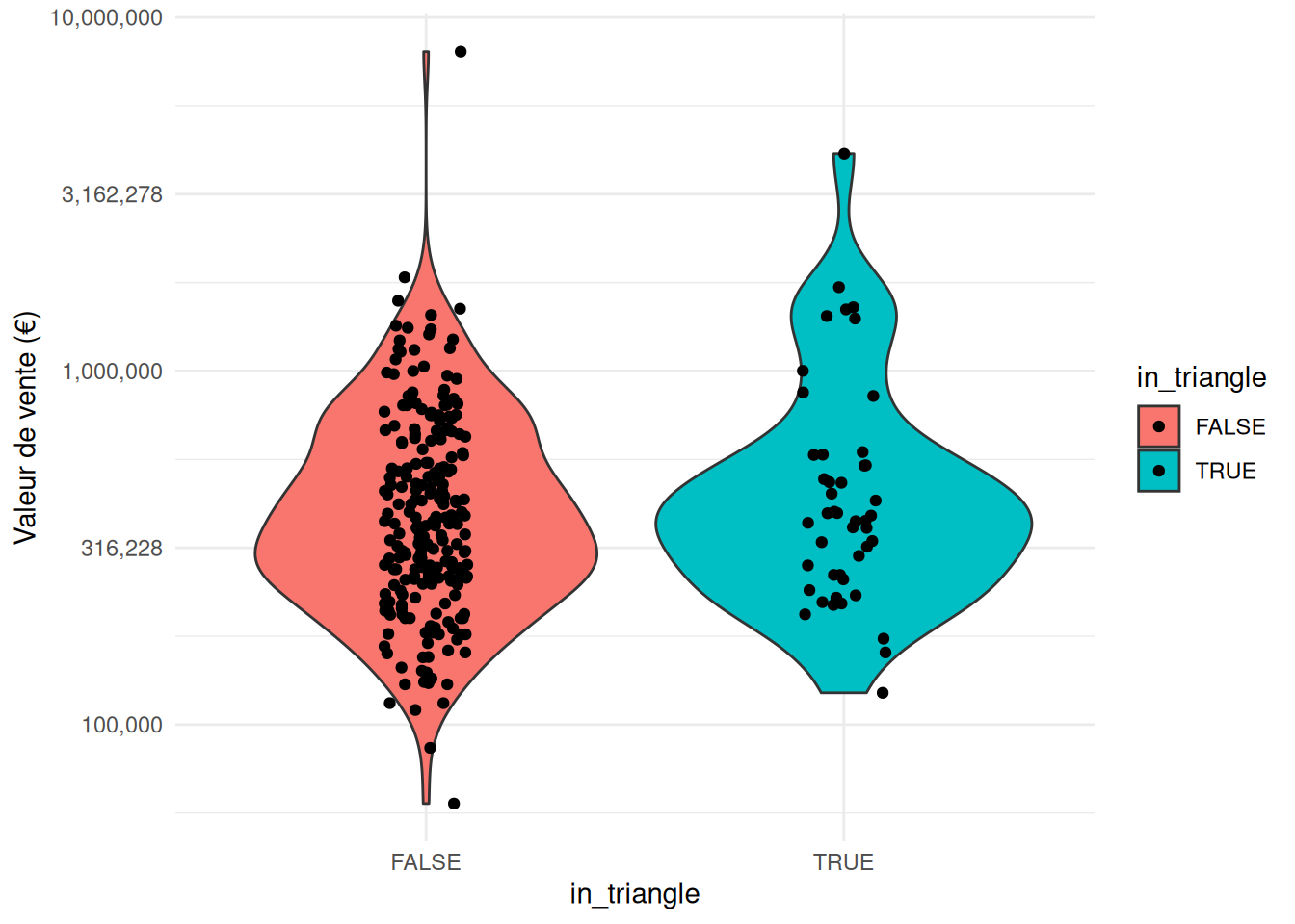 La médiane des prix est un peu plus élevée dans le Triangle qu’en dehors. On peut aller au-delà et étudier la distribution des transactions. Bien que la taille d’échantillon soit réduite, on a ainsi une idée de la diversité des prix dans cette bucolique commune de Malakoff.