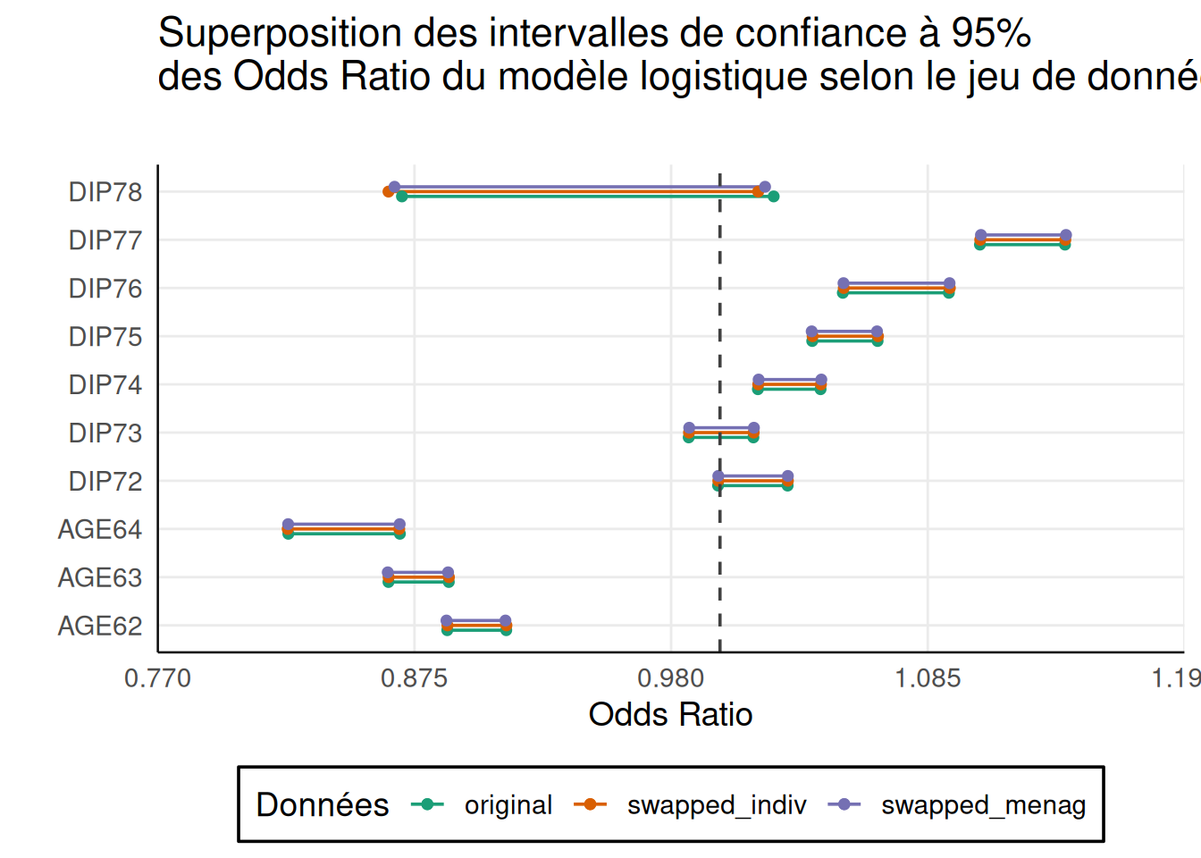all_cios |> filter(substr(vars, 1, 4) %in% c("DEP1","AGE6","DIP7")), titre = "Superposition des intervalles de confiance à 95%\ndes Odds Ratio du modèle logistique selon le jeu de données")