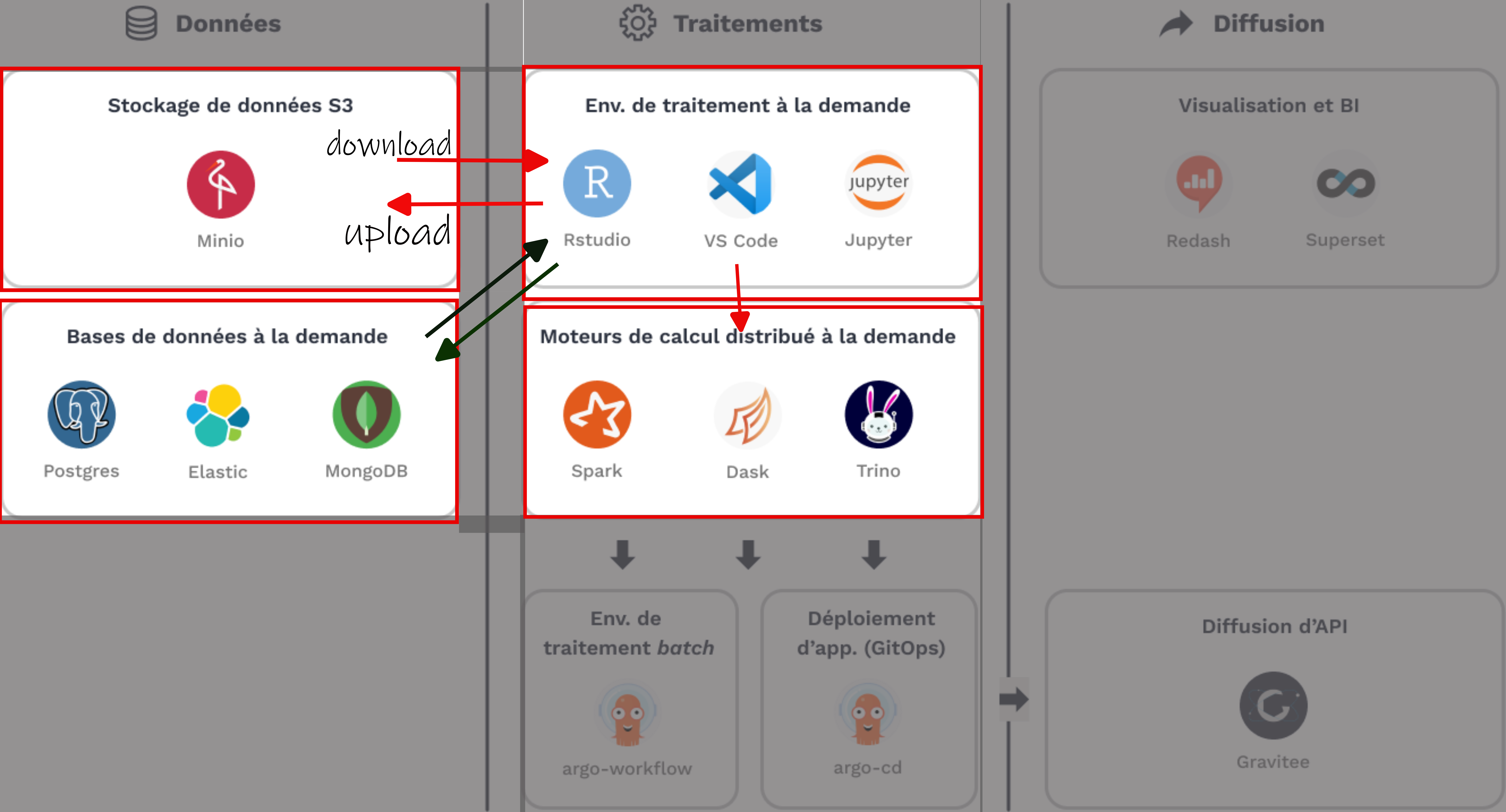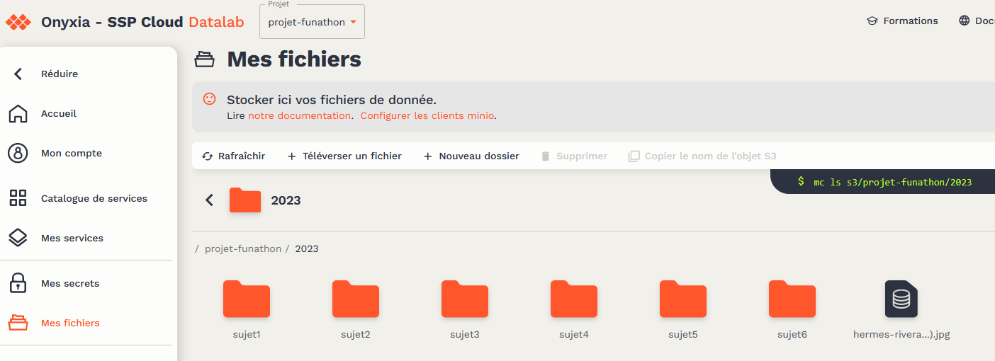 Python (Boto3 ou S3Fs) ou R (aws.s3)MinIOPython (Sujet d’analyse textuelle)Pour le lien de lancement Python