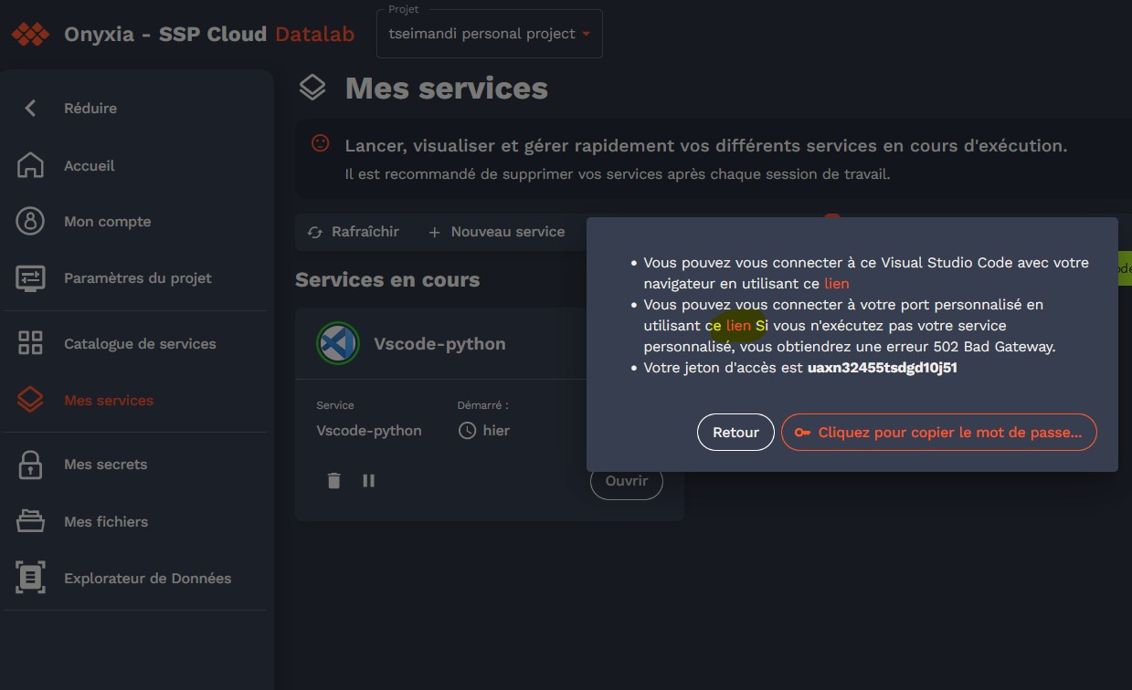 L’application est disponible à une URL indiquée sur l’interface utilisateur du SSP Cloud. Voici comment accéder au lien : depuis la page Mes Services, cliquer sur le bouton Ouvrir du service VSCode, puis sur le lien indiqué dans le texte (voir la capture d’écran ci-dessous). Pour rappel, il faut que vous ayez lancé le service VSCode en changeant la configuration (ouverture du port custom 5000 dans l’onglet Networking).