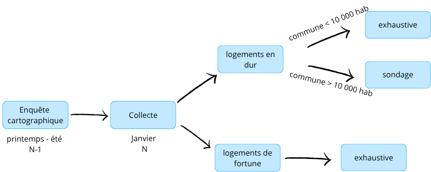 Enquête cartographique → alimente le RIL → constitue la base de sondage des logements durs des communes ≥ 10 000 habitants
