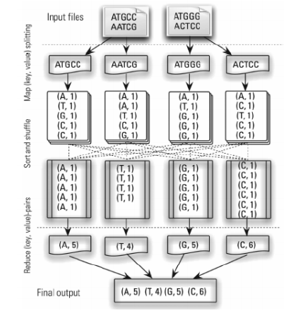 La même opération réalisée en MapReduce, correspond aux opérations suivantes : lors du chargement des données, la séquence a été coupée en plusieurs sous-séquences chargées sur différentes machines ou nœuds ; la première étape (map) consiste alors à appliquer au niveau de chaque noeud une fonction dont le résultat est une liste de couples constitués chacun d’une clé et d’une valeur. Ici, la clé correspond au symbole lu, et la valeur à l’occurrence 1 : on a donc une liste de couples (A,1), (G,1), (T,1), (A,1),.. Dans une deuxième étape de triage (« shuffling and sorting »), on rassemble sur un même nœud toutes les paires correspondant à une même clé. Finalement, on applique une fonction d’agrégation (reduce) qui combine (ici on somme tout simplement) les valeurs correspondantes à chaque clé. On aboutit dans cet exemple à quatre paires constituées d’un symbole et du nombre d’occurrences de ce symbole sur l’ensemble de la séquence.