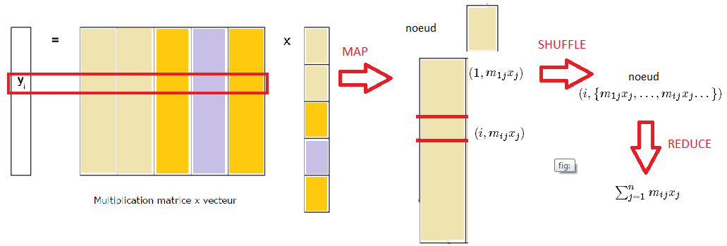 Autre exemple plus traditionnel en économétrie, la multiplication d’une très grosse matrice M avec un vecteur x : on pourra répartir les colonnes de la matrice sur différents nœuds et procéder localement à la multiplication de ces colonnes avec les composantes correspondantes de x, avant d’agréger le résultat final.