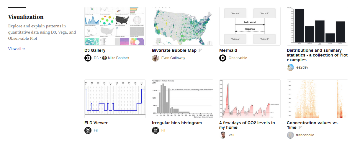 Afin de permettre une diffusion accrue de visualisations en JavaScript, Mike Bostock, déjà créateur de la librairie de dataviz de référence D3.js, est à l’origine de la plateforme observable, sorte de Github de la dataviz permettant du partage et de la réutilisation de notebooks réactifs. En cette année 2022, la plateforme a connu un véritable boom et est devenu un incontournable dans le domaine. L’une des raisons est l’ajout de fonctionalités qui permettent d’étendre le public cible au delà des développeurs web, déjà accoutumés à Javascript. Parmi les fonctionalités les plus remarquables, la possibilité depuis Novembre d’utiliser des requêtes SQL grâce à DuckDB permet aux habitués de R ou de Python de retrouver des manipulations auxquels ils sont habitués. La librairie Plot offre une grammaire proche de ggplot2.