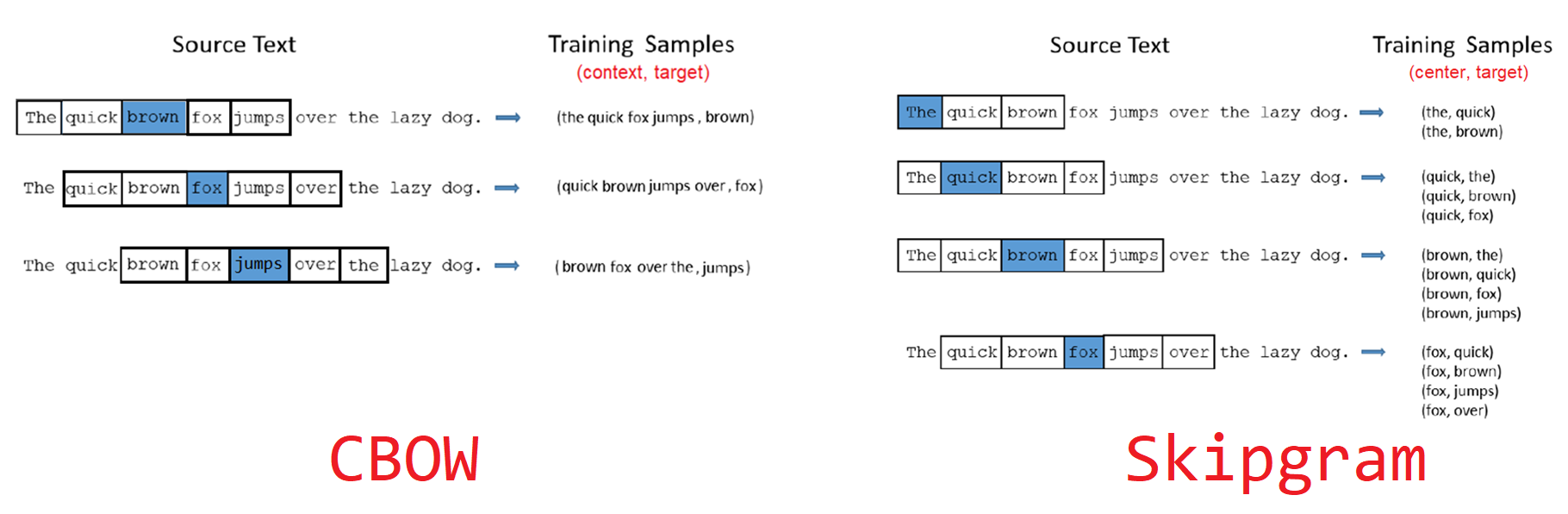 - Continuous bag of words (CBOW), où le modèle est entraîné à prédire un mot à partir de son contexte ;