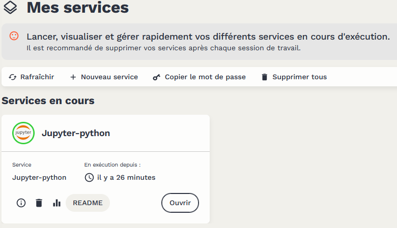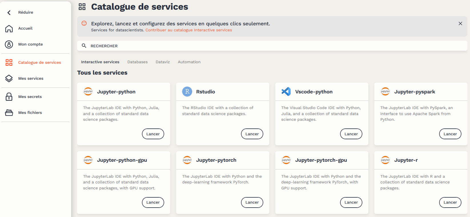 Les services interactifs comme Jupyter, VSCode ou RStudio permettent alors à l’utilisateur d’accéder à une interface pour exécuter des traitements Python ou R.