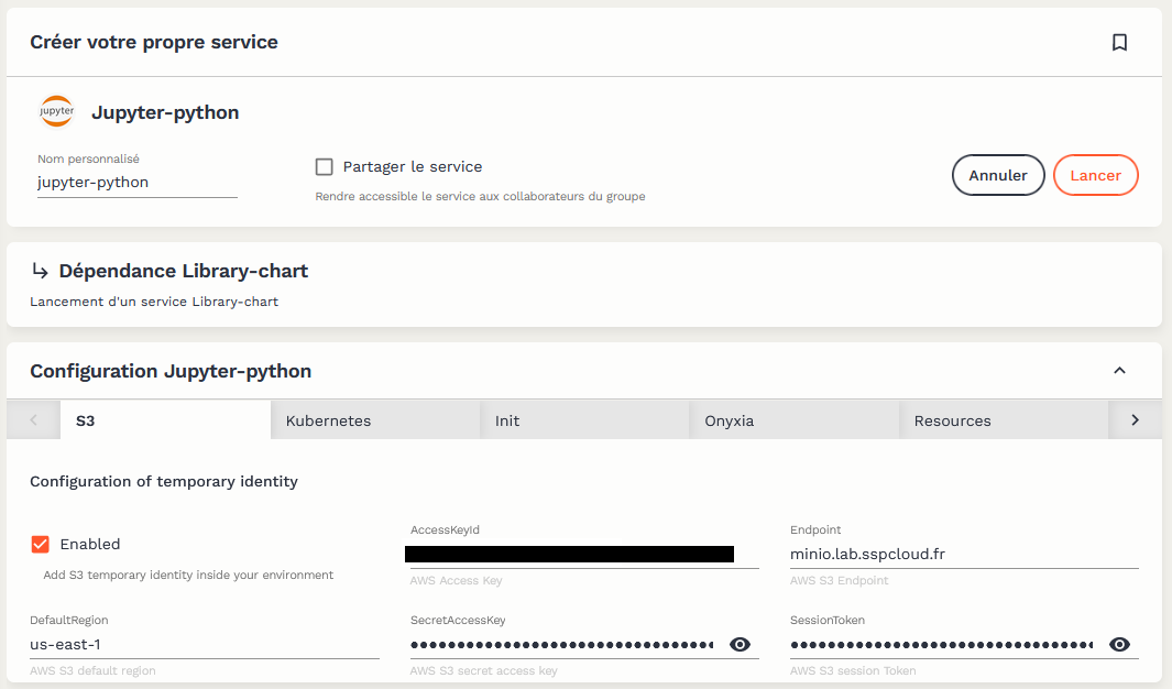 Les data scientists et statisticiens n’ont donc pas besoin de connaître les détails du fonctionnement des briques techniques d’Onyxia pour utiliser la plateforme. Les éléments techniques comme la connexion au système de stockage sont, par défaut, déjà configurés :
