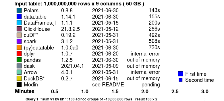 Le benchmark suivant, effectué par H2O, propose un comparatif de la vitesse des principaux frameworks de manipulation de données pour effectuer une agrégation par groupe avec un jeu de données de 50GB: