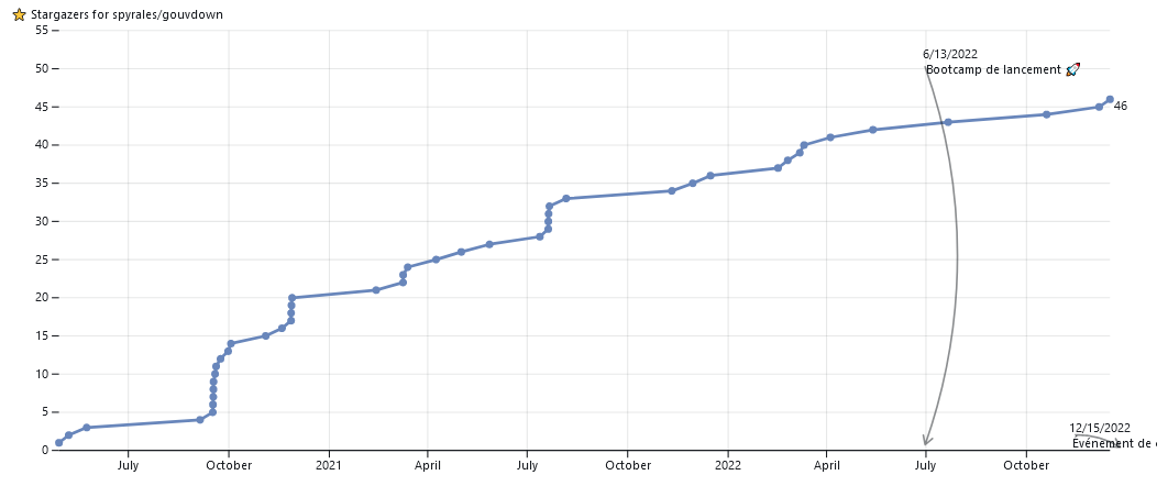 Cette visualisation fait appel à l’API Github. Si les figures ne s’affichent pas, cela peut être dû à un dépassement du nombre de requêtes par heure autorisées par l’API Github sans jeton. A l’heure actuelle, il n’existe pas encore de fonctionalité gratuite sous Observable pour stocker de manière sécurisée un jeton pour l’API Github.
